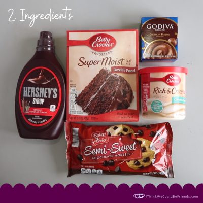 2) Recipe Ingredients: You can put in as many or few ingredients as you like, but I decided to put in the chocolate components and frosting. I included the cake mix, pudding mix, chocolate chips, chocolate syrup and frosting (cream cheese is the best for this cake!). And because it is for a gift, I splurged on the Godiva pudding mix, it was only about $0.50 more and looks so nice in the basket!!