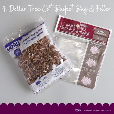 4) The final step is to wrap up your gift basket! I love these gift basket bags from the Dollar Tree. Their filler and bows work great, too! Snuggle everything into the Bundt pan, put it in the bag, add a bow and you’re set!!
