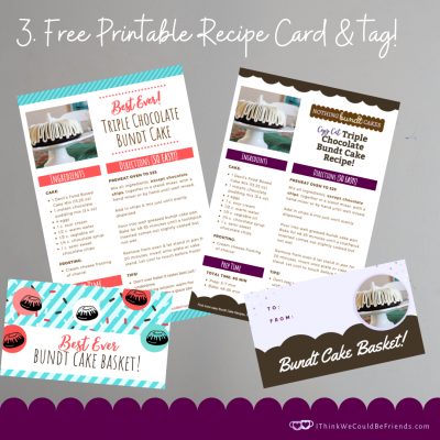 3) Next is to print the free recipe card & gift tag! I created two different versions, so you can select which one you like the best. One says “Best Ever Triple Chocolate Bund Cake” and the other says “Nothing Bundt Cakes Copy Cat Triple Chocolate Bundt Cake Recipe.” If you have Nothing Bundt Cake stores in your area, you might want to select this one, it will give your gift basket clout ;)