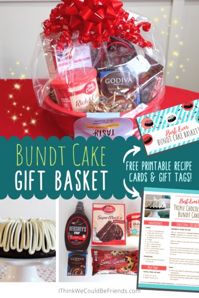 This Bundt Cake Gift Basket will be a huge hit this holiday season! The recipe is a copy cat from Nothing Bundt Cakes Triple Chocolate Bundt Cake– and it’s PHENOMENAL!! Even if you don’t make this gift basket, you should print and bake this recipe!!